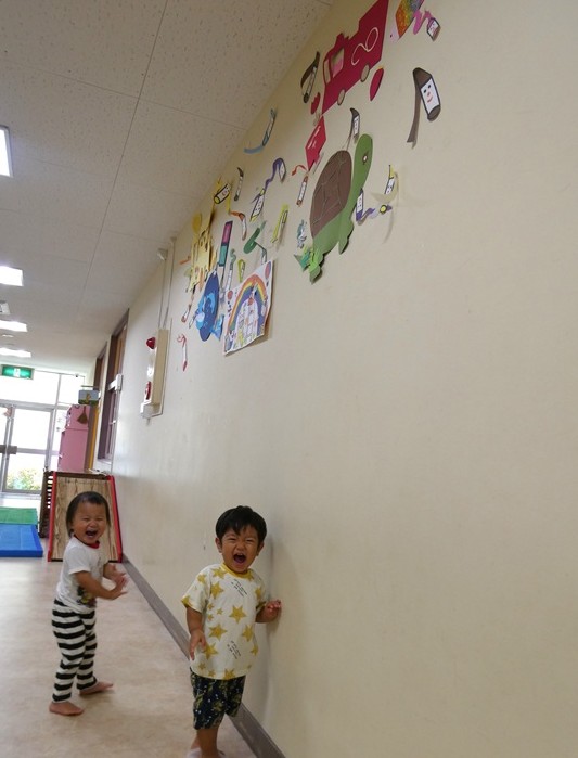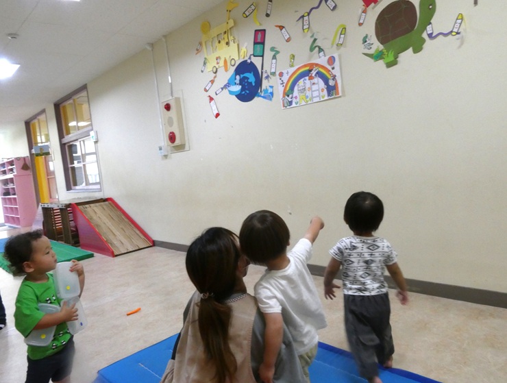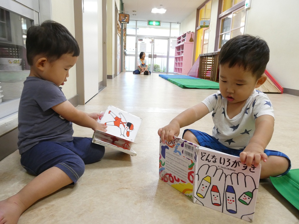 みんなが大好きな絵本の壁面ができました。こどもたちは「どんないろがすき♪」の絵本を探し“いっしょだね”と指を差しうれしそうです。保育士に“うたって”と絵本を開くと、歌に合わせて「あか!」と元気よく歌う1歳児さん。「み~ずいろ~がすき♪」と自分の好きな色に歌詞を替えて歌う2歳児さん。「あかのクレヨンどこ?」「消防車あった!」といろんな発見があり、こどもたちの好きが溢れています。